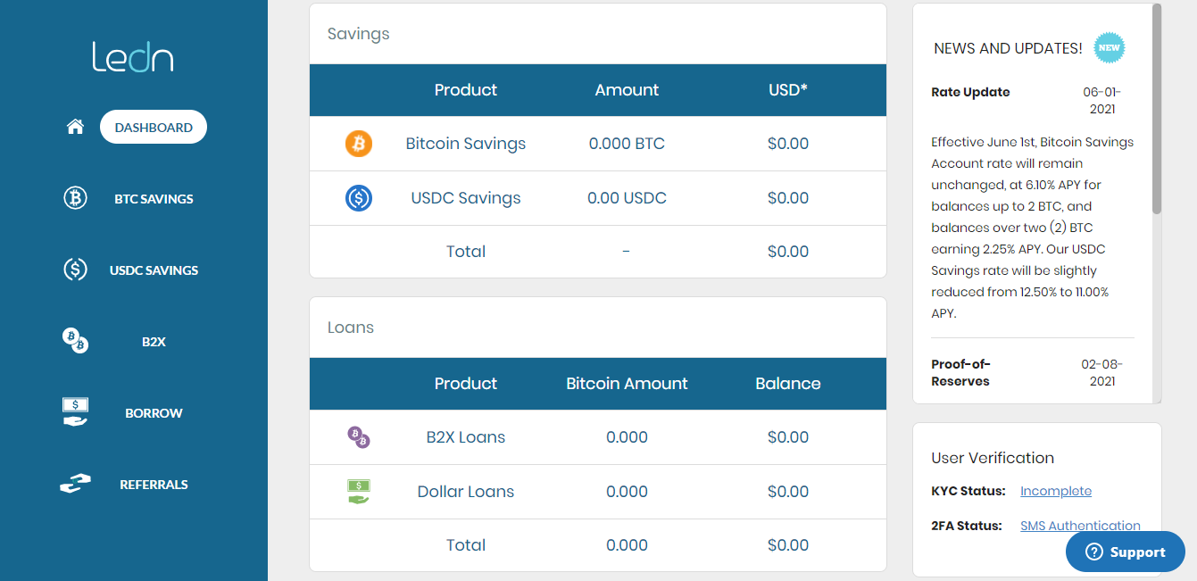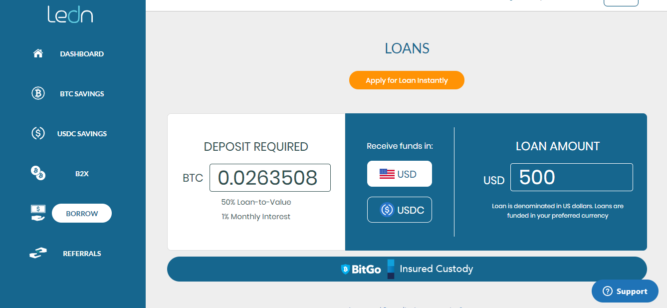 Ledn provides as easy to use platform to lend and borrow USDC or BTC at competitive rates.